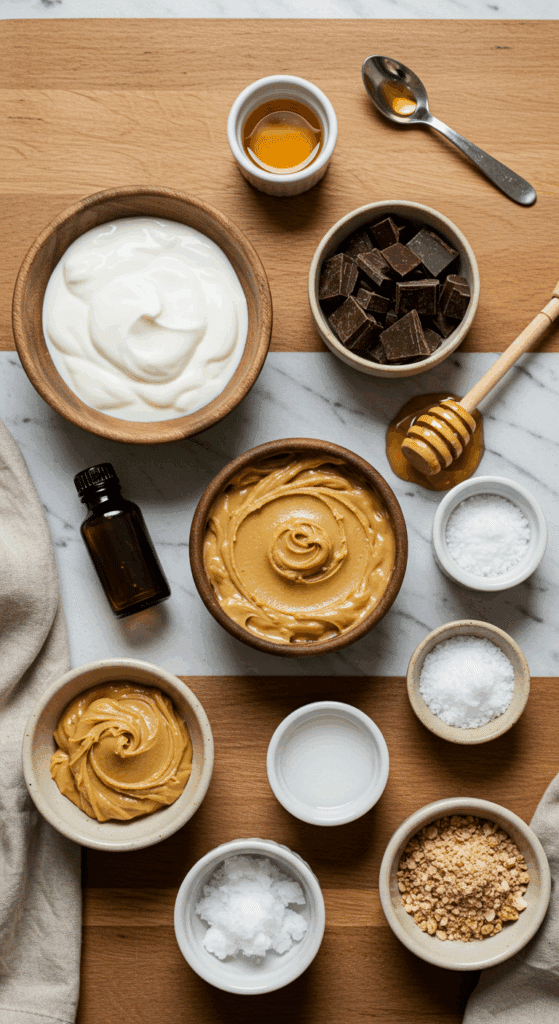 Here’s what you need to make these Frozen Chocolate Peanut Butter Yogurt Cups. Each ingredient adds to the creamy, chocolatey, and nutty magic.