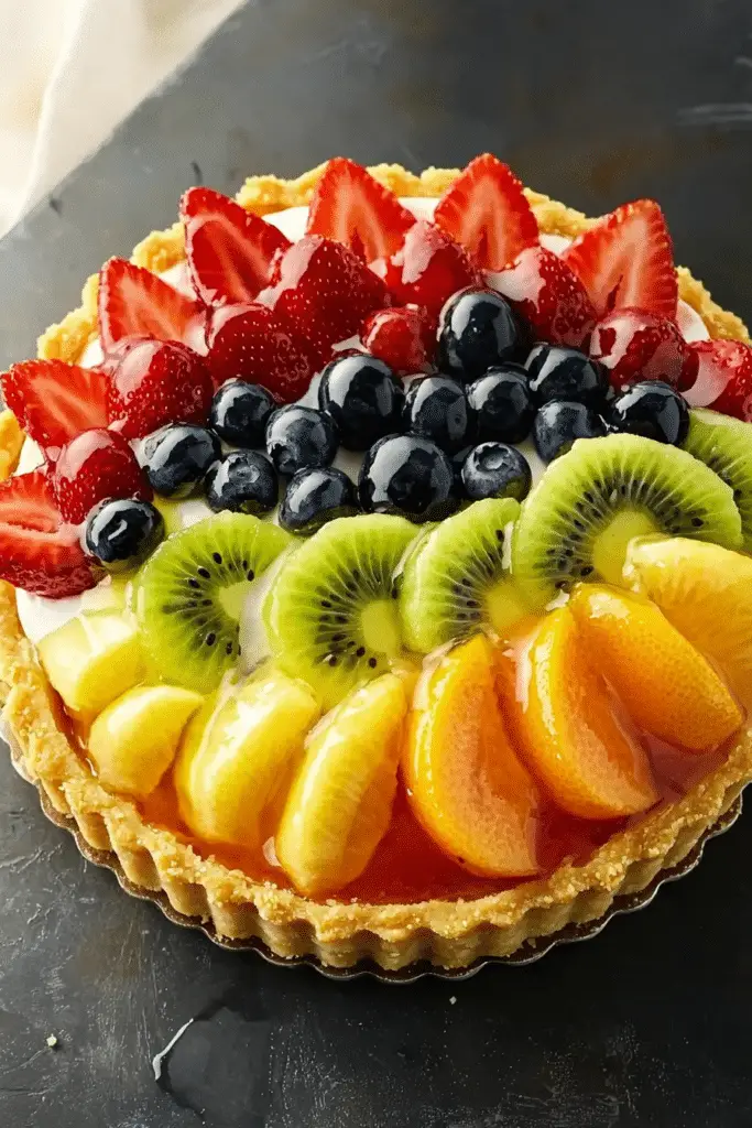 Summary: This dessert features a large, round shortbread-style crust baked on a pizza pan, topped with a creamy white chocolate cream cheese filling, arranged with assorted fresh fruits, and finished with a simple pineapple juice glaze. It’s an easy-to-assemble, visually stunning dessert perfect for sharing.