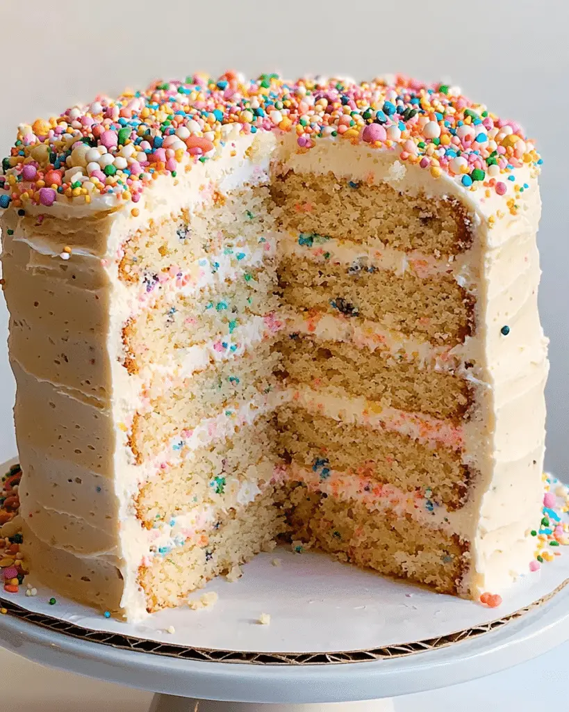 Summary: This layer cake captures the flavor of Fruity Pebbles cereal through multiple components: cereal-infused buttermilk in the cake batter, a cereal milk soak for the layers, a baked cereal crumb filling/topping, and a cereal milk-flavored buttercream frosting. It’s a fun, nostalgic, and flavorful celebration cake.