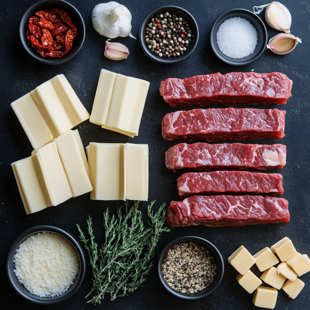 Let’s explore the key ingredients that make this dish so special! For the steak tips, we use [strip steaks, seasoned with Kinder’s Buttery Steak Seasoning or your favorite steak seasoning, and seared in olive oil and butter for a flavorful crust]. Then comes the [garlic, adding a fragrant and savory touch]. For the sauce, we combine [chicken broth, heavy cream, Parmesan cheese, red pepper flakes, oregano, thyme, and sun-dried tomatoes, creating a rich and flavorful sauce with a hint of heat]. And finally, the [rigatoni pasta, cooked al dente for a perfect texture].