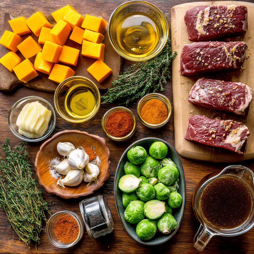 The magic of Slow Cooker Garlic Butter Steak with Brussels Sprouts and Butternut Squash comes from its bold, earthy ingredients. Each one adds savoriness, sweetness, or texture to create a cohesive, fall-inspired dish. Here’s what you’ll need: