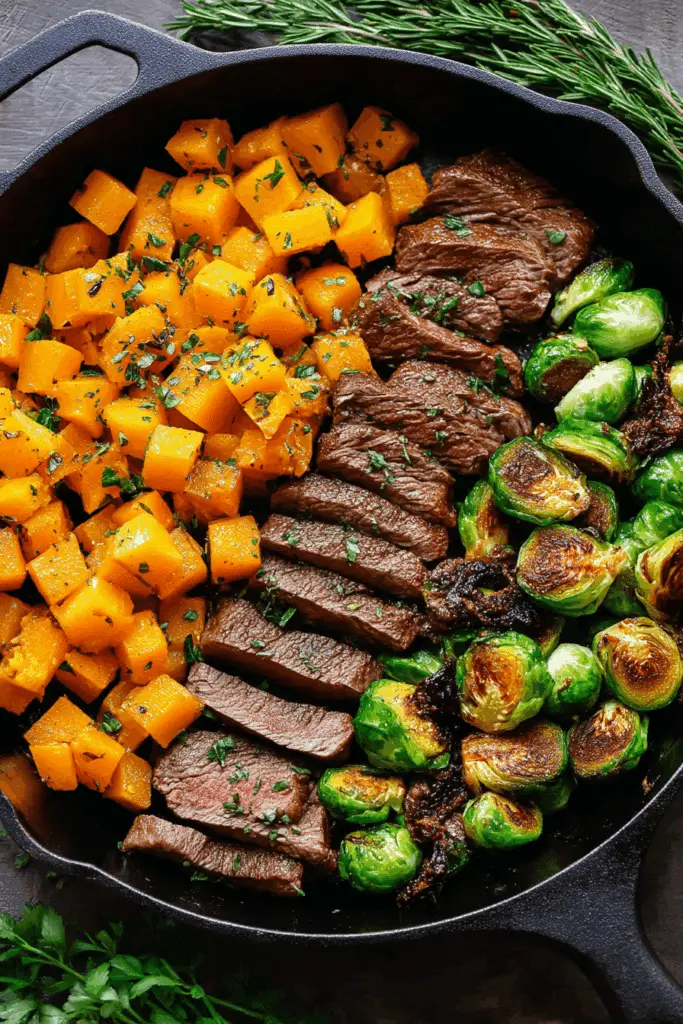 Why They’re Important: The flank steak delivers a savory, protein-packed core, while the garlic butter sauce adds rich, aromatic depth. Butternut squash and Brussels sprouts provide sweet and earthy contrast, and smoked paprika and thyme enhance the dish with smoky, Mediterranean-inspired warmth, making each bite a cozy delight.