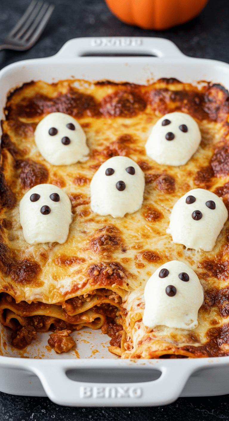 3. Mummy Lasagna Rolls: Roll filling in individual noodles instead of layering, then top with ghost shapes. Variation Vibe: Fun, single-serve “mummies” that kids love.