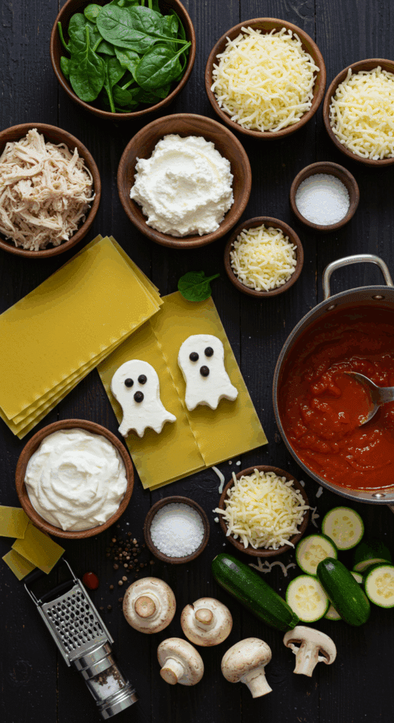 The magic of Ghostly Lasagna comes from simple ingredients that layer into a creamy, spooky dish. I’ll list everything for 4 servings (using an 8×8-inch baking dish), explain why each is key, and offer substitutions for dietary needs or pantry swaps. Let’s build this haunted lasagna!