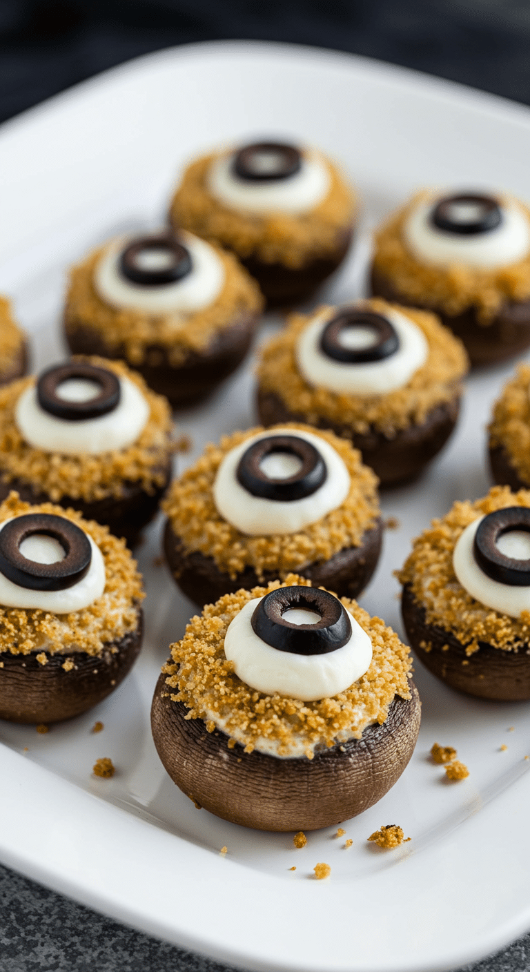 Arrange mushrooms on a dark platter (black or slate) to make the eyeballs pop. Place them gill-side up to show off the filling and eyes. For extra spook, scatter extra olive pieces around the platter to mimic “scattered bugs” or sprinkle with paprika for a “dusty” effect. Serve hot with toothpicks for easy grabbing at parties.