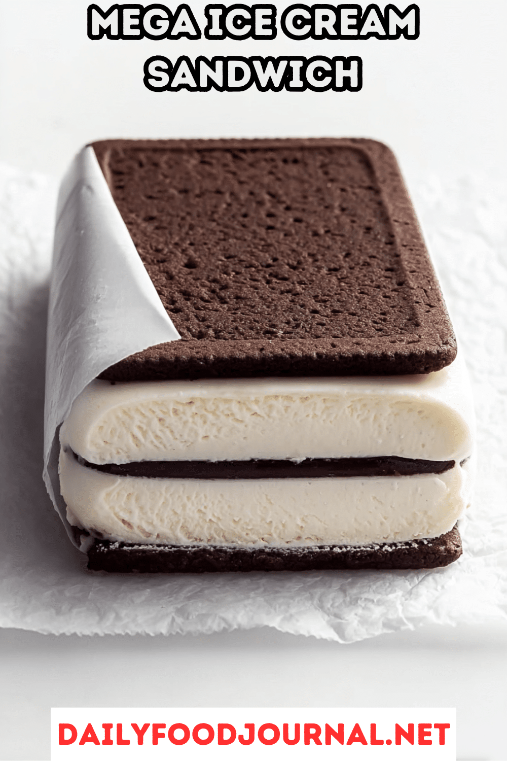 Picture slicing into a colossal ice cream sandwich, with two layers of rich, chocolatey devil’s food cake hugging a thick slab of creamy vanilla ice cream, perfect for feeding a crowd at a party or family gathering.