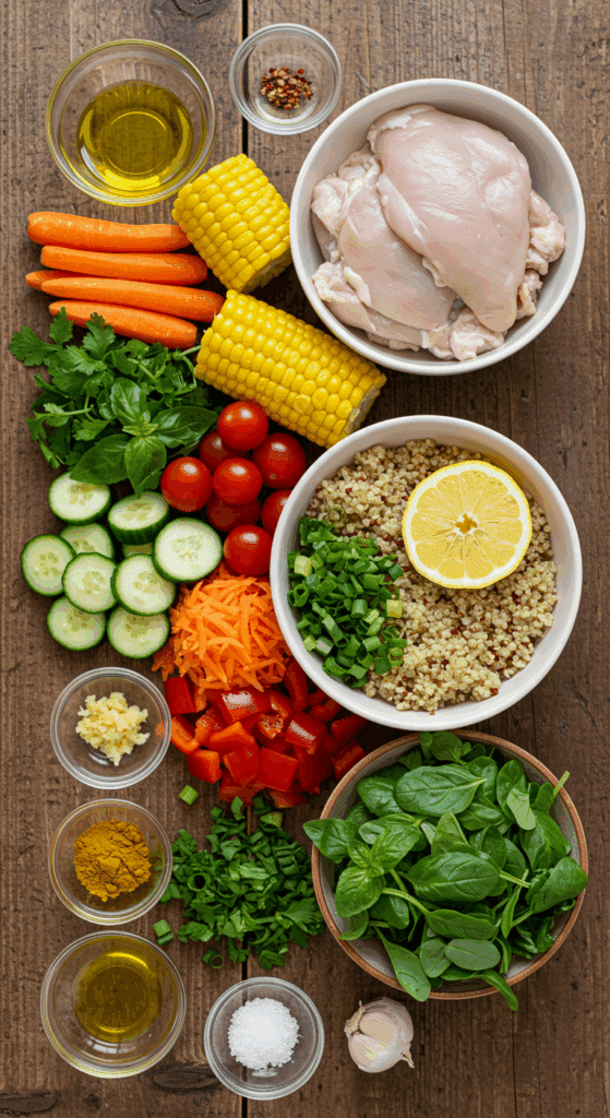 - In a large mixing bowl, combine 2 cups cooked quinoa, grilled chicken, grilled corn kernels, cherry tomatoes, carrot, cucumber, red bell pepper, and chopped herbs.