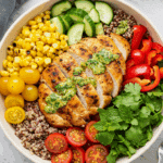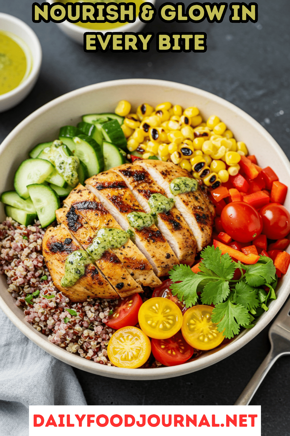 Craving a colorful, healthy dish that’s bursting with flavor? These Glow Bowls are your perfect choice! Featuring grilled chipotle-marinated chicken thighs, charred sweet corn, quinoa, cherry tomatoes, cucumber, carrot, red bell pepper, and fresh herbs, all tossed with a zesty curry vinaigrette and served over greens, this dish is a delightful mix of smoky, tangy, and fresh flavors.