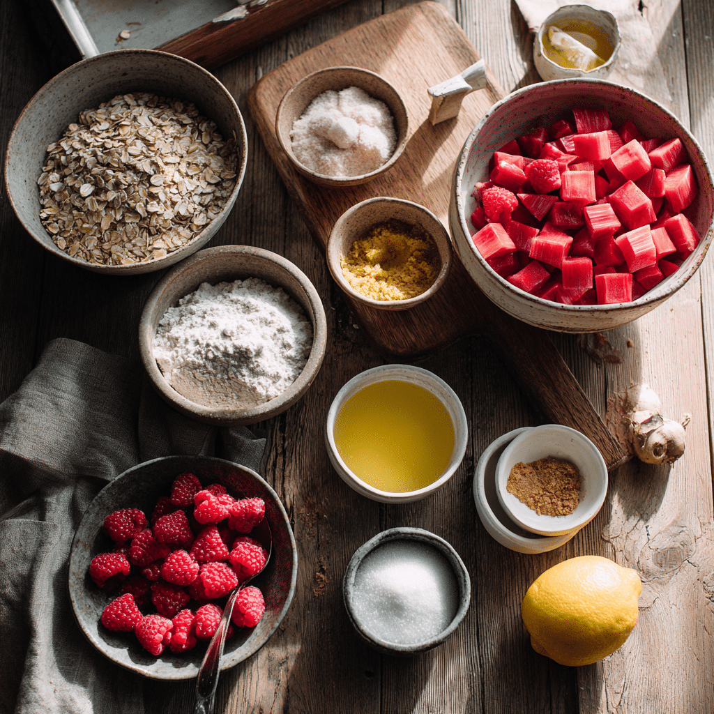 These Gluten-Free Raspberry Rhubarb Crumble Bars use wholesome ingredients for a flavorful, gluten-free treat. Here’s what you need and why each one matters: