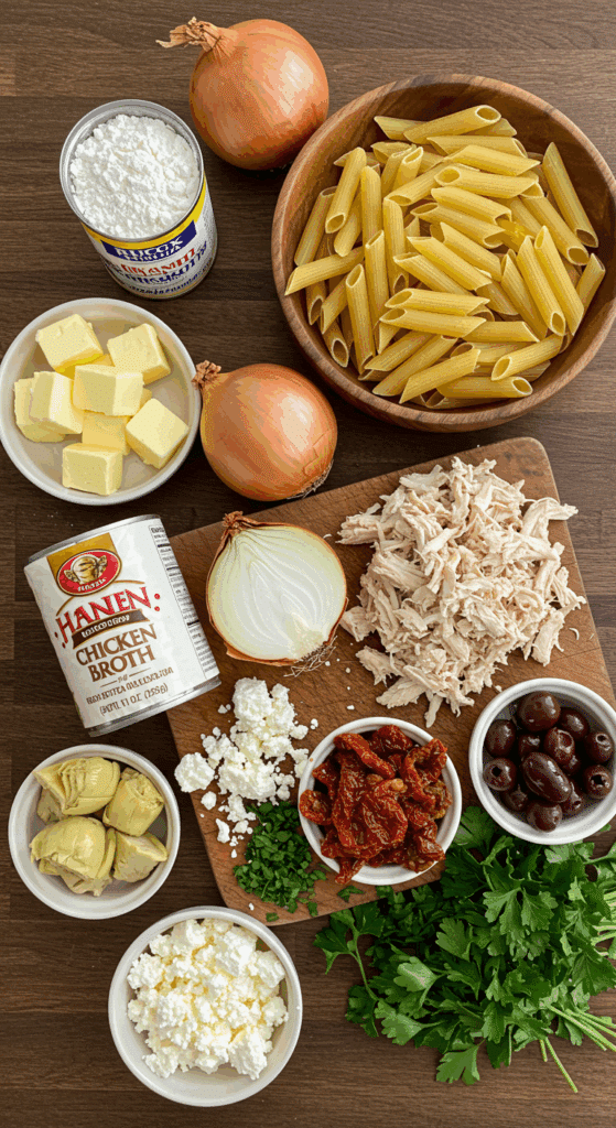 Why These Ingredients Matter: The chicken and feta provide protein, while the artichokes, tomatoes, and olives add fiber, vitamins, and bold Mediterranean flavors. The creamy sauce and pasta create a comforting base, making this a balanced, satisfying meal that’s both hearty and fresh.