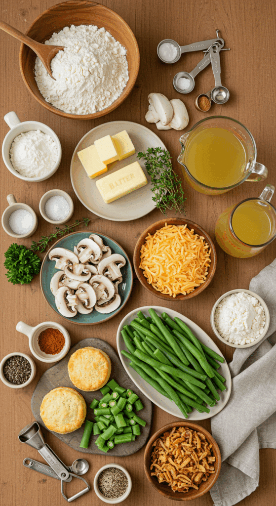 • Gather all ingredients: 1 ½ cups flour, 2 teaspoons baking powder, 1 teaspoon salt, 4 tablespoons butter, 1 ½ cups Cheddar, 2 tablespoons parsley, â…” cup half-and-half (for dough); 4 tablespoons butter, 1 small onion, 8 ounces mushrooms, 4 thyme sprigs, salt, pepper, 5 tablespoons flour, 2 ½ cups chicken broth, 2 ½ cups half-and-half, 1 pound green beans, and 1 ½ cups fried onions (for filling).