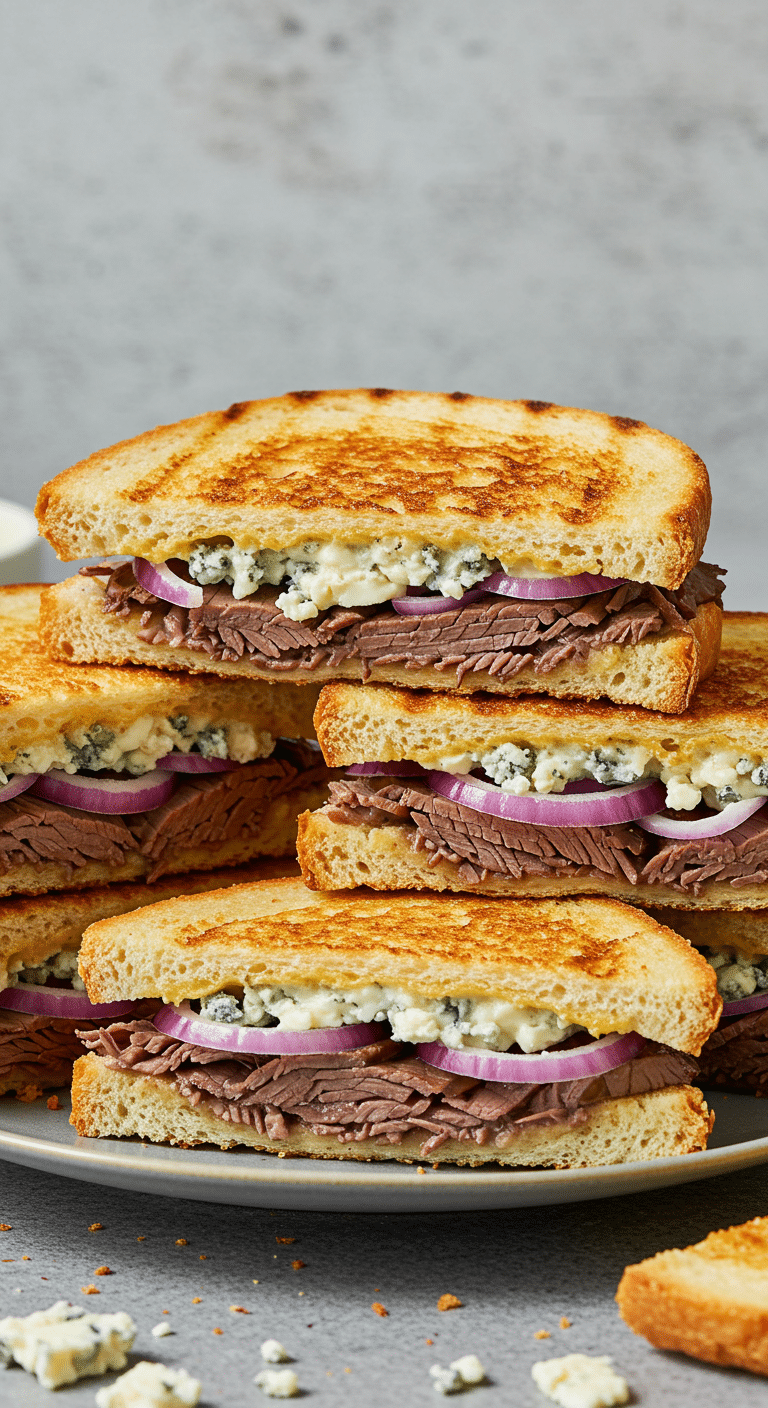 Craving a quick, indulgent meal that combines savory roast beef with bold blue cheese in a crispy, grilled sandwich? The Grilled Beef & Blue Cheese Sandwiches recipe is your answer! This dish features tender deli roast beef, a creamy blue cheese spread, and sweet red onion, all sandwiched between golden, buttery sourdough slices