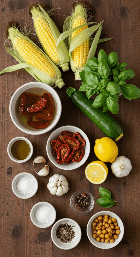 Here’s what you need to make Grilled Corn & Zucchini Salad with Sun-Dried Tomato Vinaigrette. Each ingredient adds to the smoky, tangy, and vibrant magic.