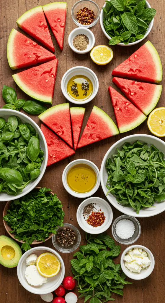 Here’s what you need to make these Grilled Watermelon Steaks with Arugula and Herb Salad. Each ingredient adds to the smoky, juicy, and vibrant magic.