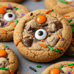 Halloween Chocolate Chip Cookies are oversized, chewy cookies loaded with festive Halloween candies, chocolate chips, and playful candy eyeballs. Rated 4.2 stars by 11 reviewers, this recipe is loved for its crispy edges, soft centers, and deranged monster look. The colorful sprinkles and eyeballs make them a perfect Halloween treat, and their big size ensures they stand out on any dessert table.