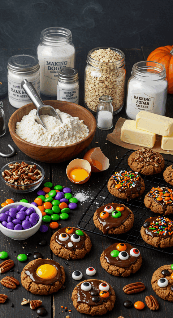 The eggs and optional pecans provide protein, while the oats add fiber, making these cookies a bit more filling than typical treats. The colorful candies and sprinkles create a fun, Halloween vibe, and the butter and sugars ensure a chewy, crispy texture. The ingredients are affordable, widely available, and easy to swap for dietary needs, like gluten-free or vegan diets, making this recipe versatile and perfect for spooky season.