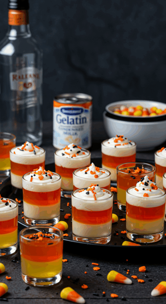 The gelatin layers provide a light, fun texture, while the sweetened condensed milk adds creaminess. Vodka brings the adult fun, and the fruit-flavored gelatins evoke candy corn colors. The whipped cream and sprinkles make them party-ready. These ingredients are easy to find and adaptable for non-alcoholic versions or dietary needs, keeping the recipe versatile and healthy-ish with portion control.