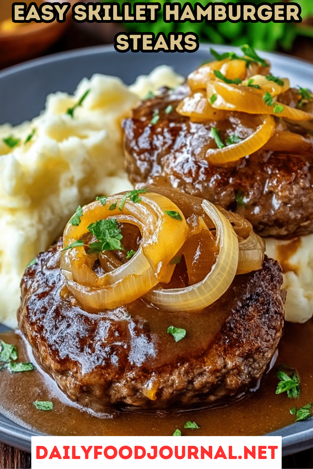 1. Serve the Steaks: Place each hamburger steak on a bed of mashed potatoes, rice, or noodles, ensuring a generous pool of creamy gravy surrounds it. Spoon extra onions and gravy over the top for a glossy, inviting look.