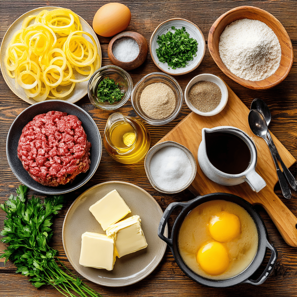 Why They’re Important: The 80/20 ground beef ensures juicy patties, while breadcrumbs and egg provide structure. Worcestershire sauce, garlic, and onion powder add savory depth, and the caramelized onions and beef broth create a rich, velvety gravy. Butter enhances flavor, and parsley elevates the dish with a fresh, polished finish.