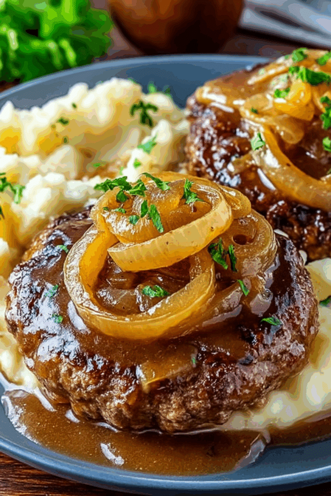 • Tip: Slice onions thinly for even caramelization. Scrape up browned bits from the patties for extra flavor. If the gravy is too thick, add ¼ cup more broth; if too thin, simmer longer.