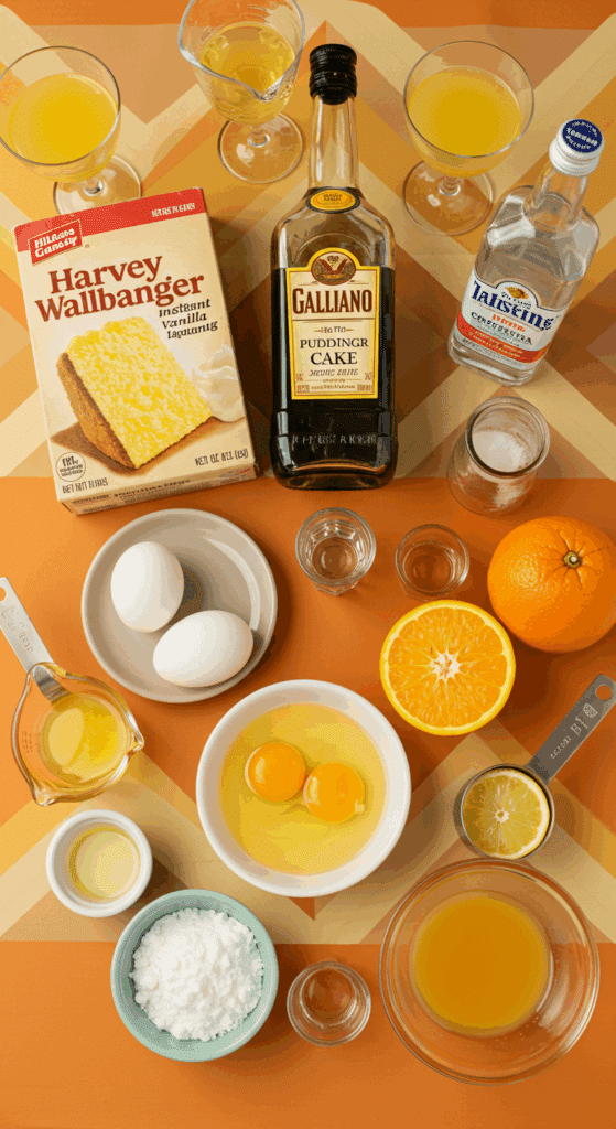 Harvey Wallbanger Cake uses a mix of pantry staples and cocktail ingredients for its signature flavor. Here’s what you’ll need for 12 servings: