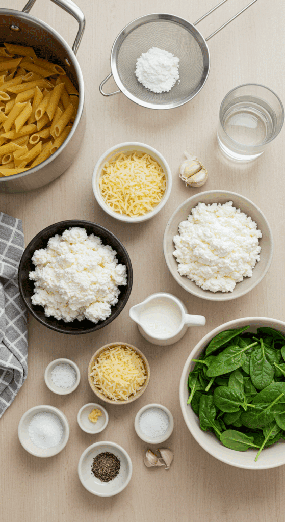 High Protein Cottage Cheese Pasta uses simple ingredients to create a creamy, flavorful dish. Here’s what you’ll need for 4 servings: