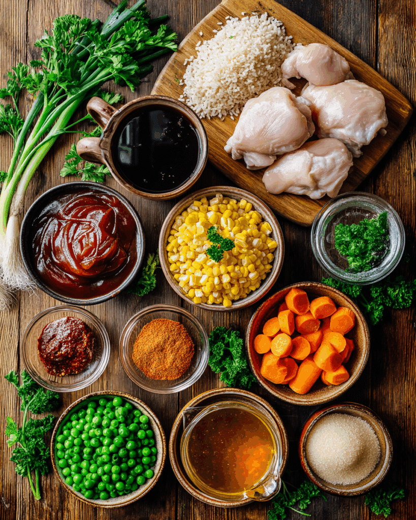 The magic of Honey BBQ Chicken Rice comes from its simple, high-impact ingredients. Each one adds flavor, texture, or color to create a balanced, delicious dish. Here’s what you’ll need: