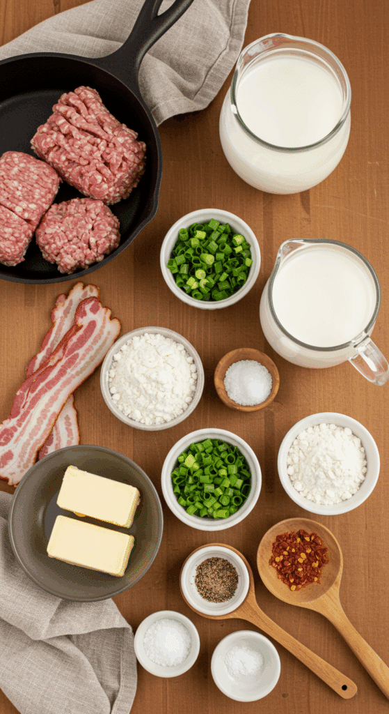 - Gather all ingredients: 2 tablespoons unsalted butter, 8 ounces breakfast sausage, 4 strips bacon, ½ cup chopped green onions (light parts) plus 1 tablespoon green parts, ⅓ cup all-purpose flour, 2 ½ cups cold milk, cayenne pepper, and salt and black pepper.