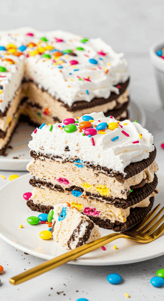 • Cookies and Cream Cake: Use chocolate ice cream sandwiches and add crushed Oreos between layers.