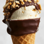 3. Create the Chocolate Shell: Dip the ice cream top into the cooled chocolate mixture, ensuring an even coating that covers the ice cream and slightly drips down the cone.