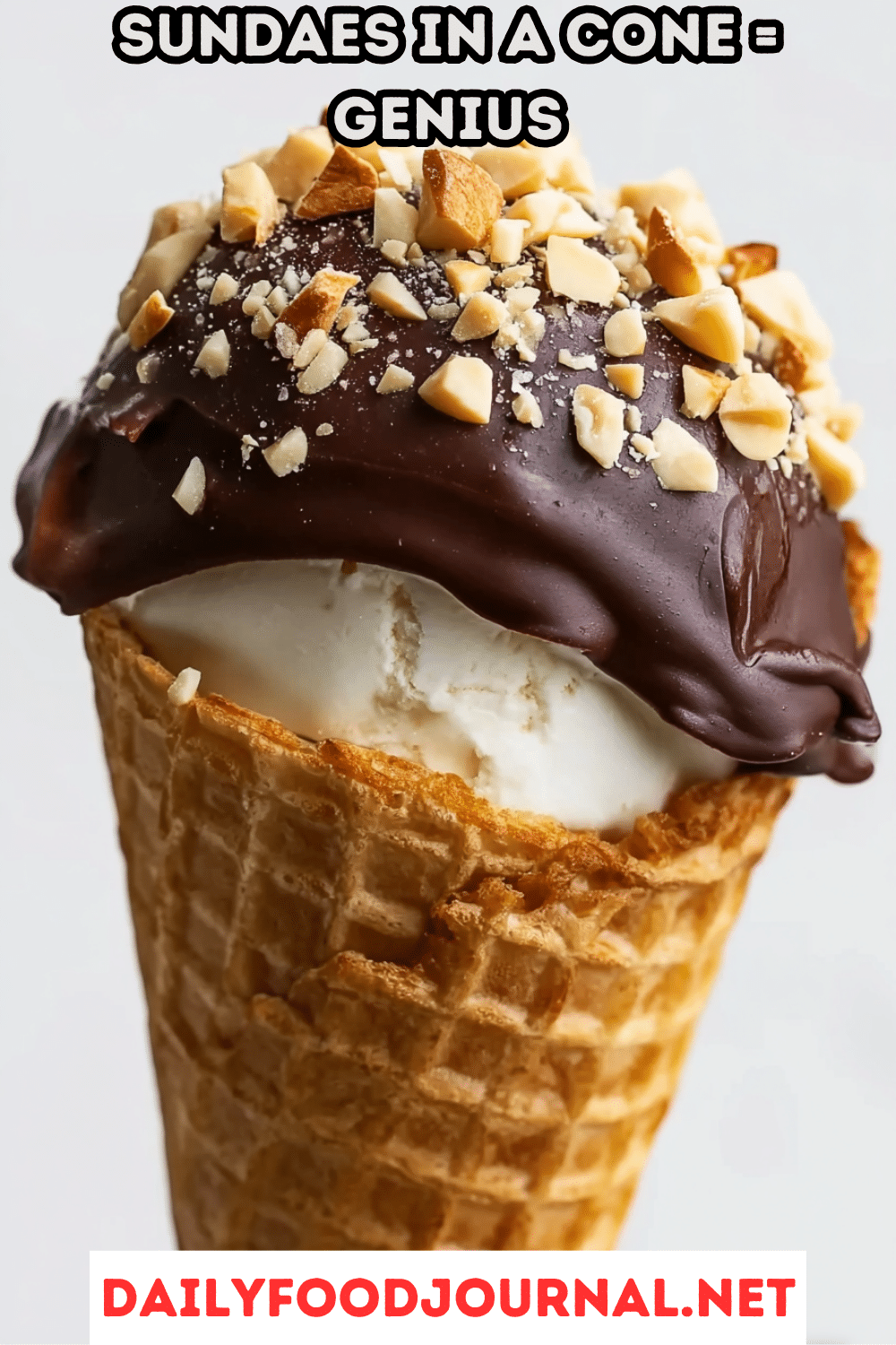 2. Add Fudge: Dot each cone with a heaping teaspoon of chocolate fudge sauce, letting it settle into the ice cream.