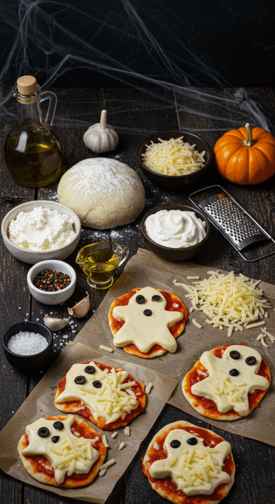 • Vegan Ghost Pizzas: Use vegan dough, ricotta, mozzarella, and olives.