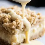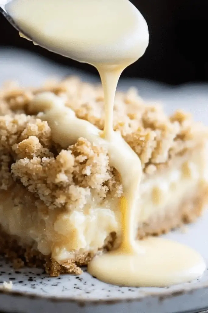 - Make Ahead: Custard sauce can be made 2-3 days ahead and kept refrigerated. Streusel topping can be made ahead and kept chilled. Bake the cake closer to serving time for best results, though it’s still good the next day.