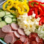 Chop the salami and provolone cheese into bite-sized pieces as well.