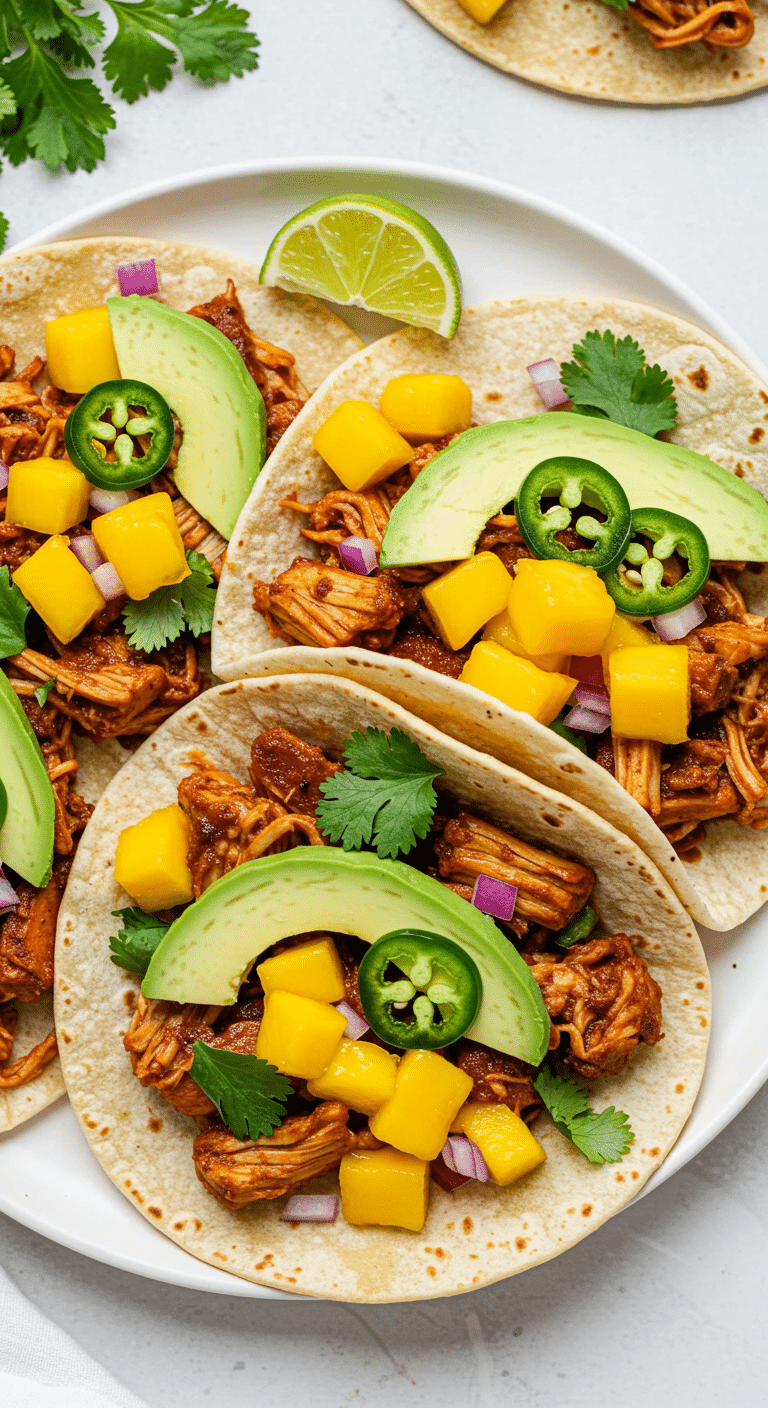 • Spoon the jackfruit filling into each tortilla and top with mango-avocado salsa.