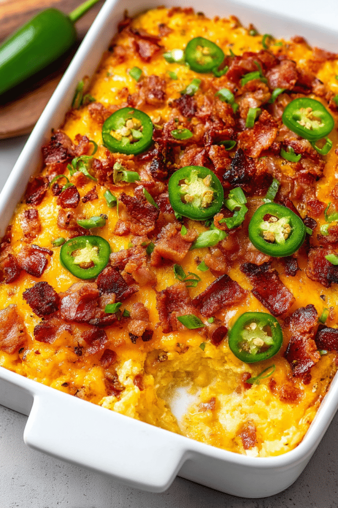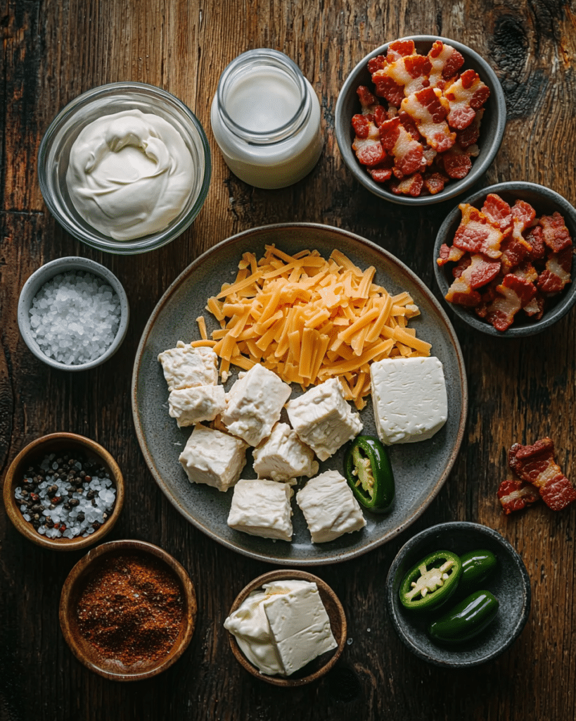 Boneless, skinless chicken breasts diced into bite-sized cubes make the perfect tender base for the casserole. Garlic powder and onion powder give the chicken a deep savory flavor without needing extra carbs. Salt and black pepper bring out the natural flavors and seasonings in every layer. Cream cheese and heavy cream blend together into a rich, velvety sauce that coats the chicken perfectly. Fresh jalapenos bring the perfect level of heat and a burst of bright, fresh flavor. Shredded mature cheddar cheese melts into gooey perfection, adding sharpness and richness. Crispy cooked bacon crumbles add a smoky crunch on top that makes every bite irresistible.