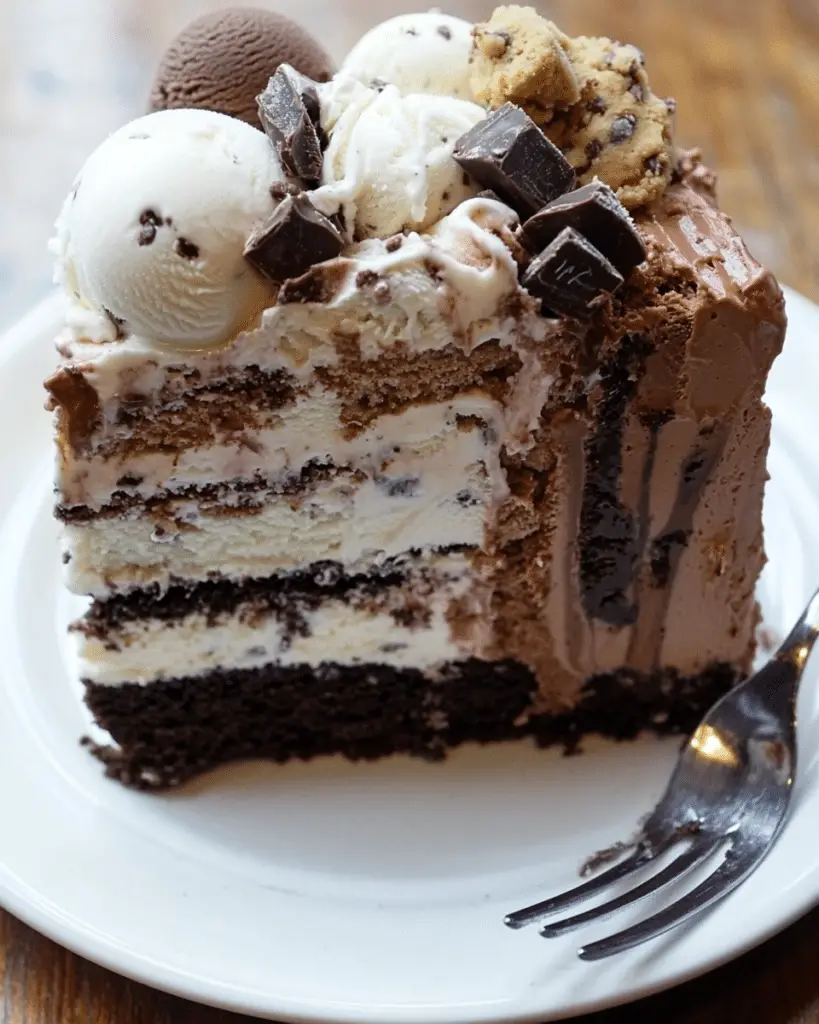 Summary: This is an elaborate, multi-layered frozen dessert featuring a chocolate cookie crust, layers of vanilla, chocolate, and birthday cake ice cream, a brownie layer, a stabilized whipped cream frosting, and a separate frozen “crown” topping made from scooped premium ice creams and mini meringues. It’s assembled in stages with significant freezing time required for each layer.