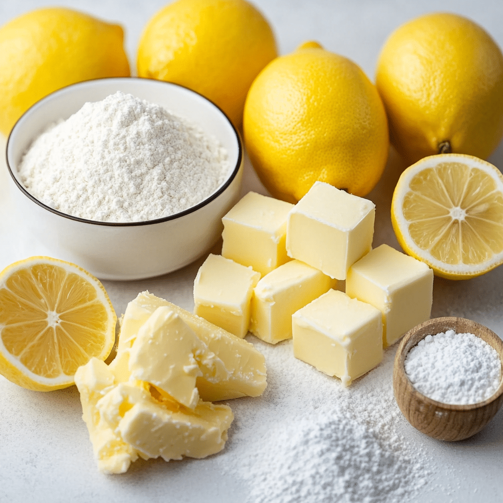 The crust, made with flour, sugar, salt, and butter. Provides a buttery and slightly sweet foundation for the lemon filling. It’s a simple shortbread crust.