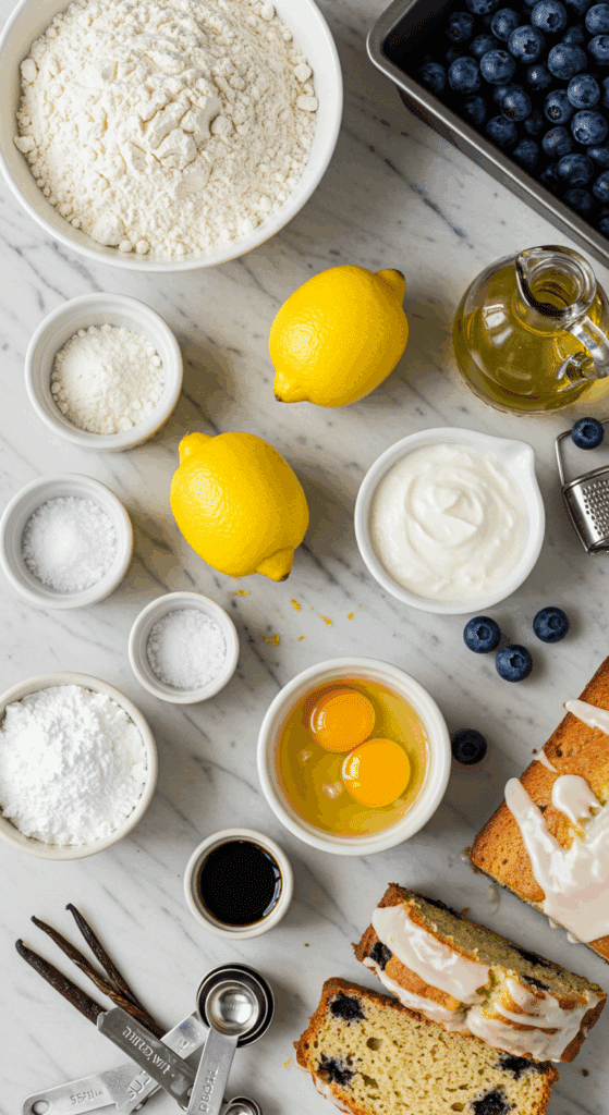 Here’s what you need to make this Lemon Blueberry Bread. Each ingredient adds to the moist, tangy, and fruity magic.