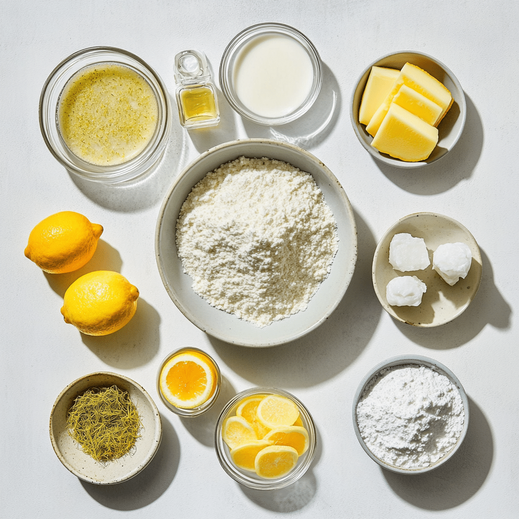 The lemon zest and fresh lemon juice provide the signature citrusy flavor. The granulated sugar adds sweetness. The butter contributes richness and tenderness.
