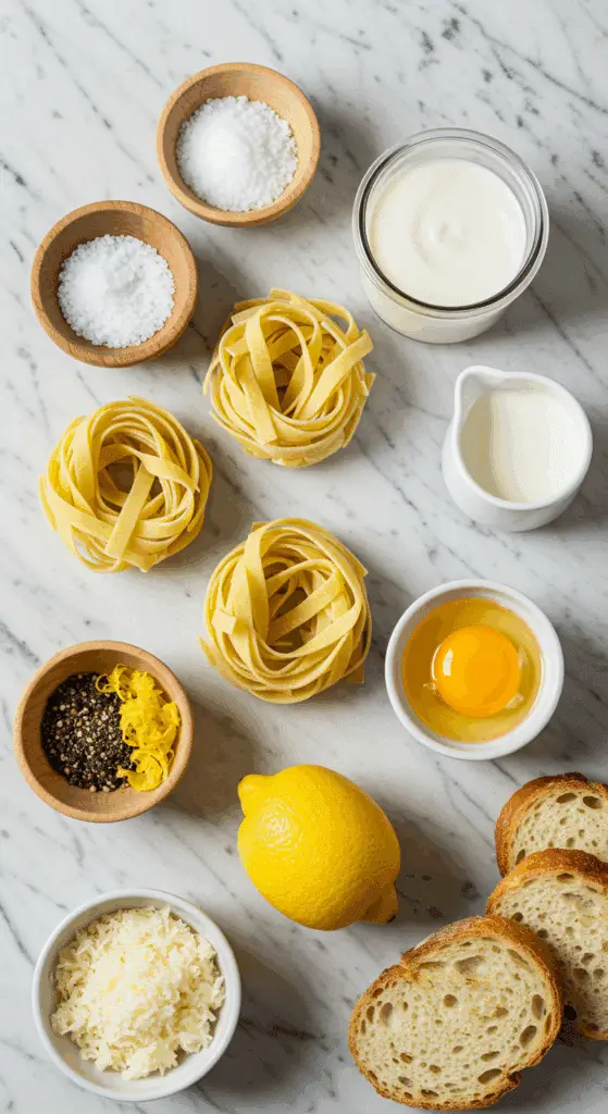 • Gather all ingredients: kosher salt, 12 ounces fettuccine, 1 tablespoon butter, 1 large shallot, 1 ¼ cups heavy cream, 1 egg yolk, 1-2 teaspoons lemon zest, ⅓ cup pecorino cheese, pepper, crusty bread (optional).