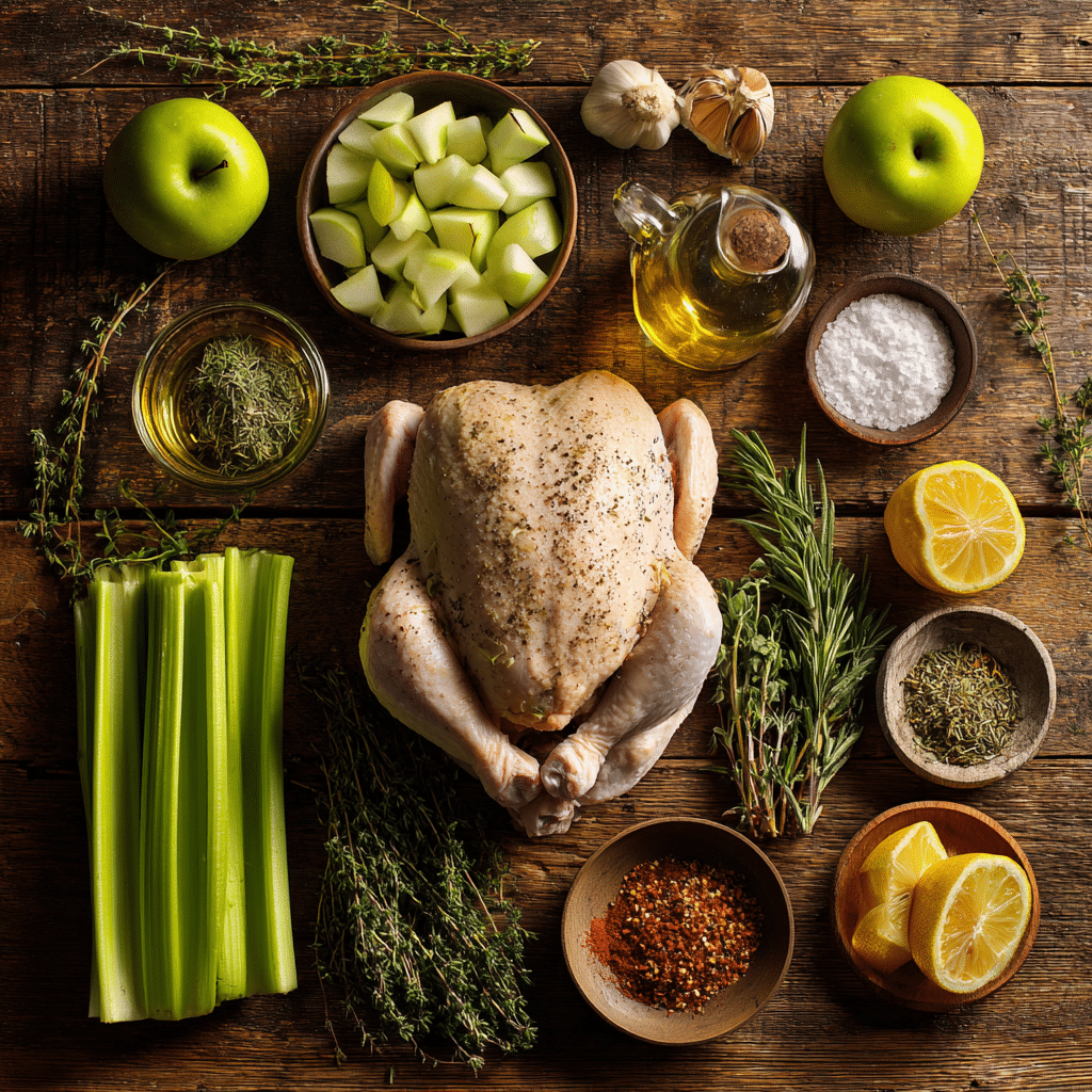 • Fill Cavity: Stuff the chicken cavity with celery pieces, chopped onion, and apple slices, packing loosely to allow air circulation.