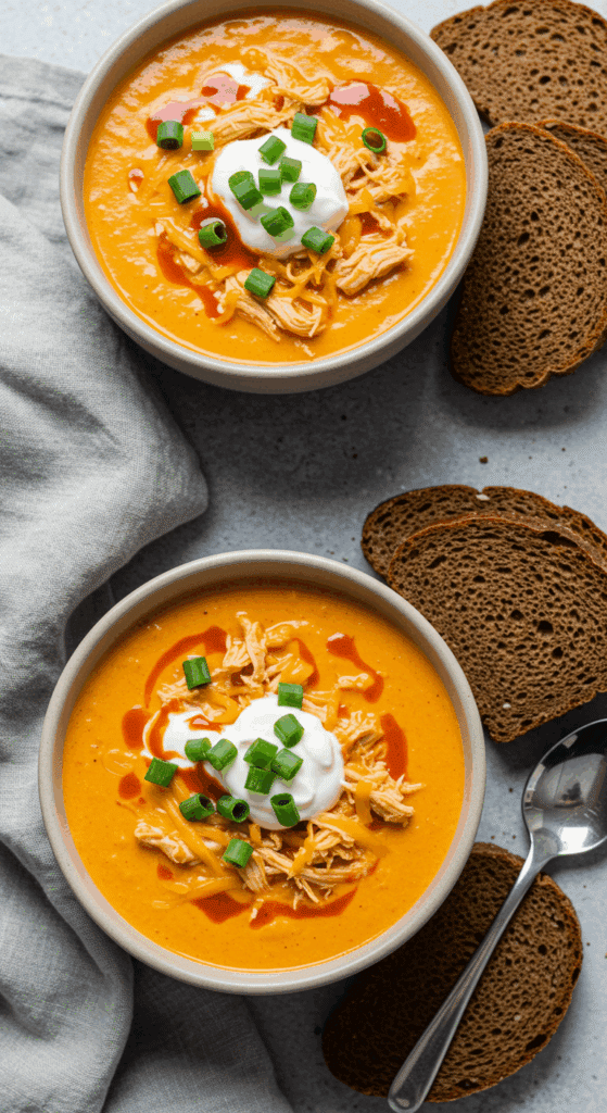 - Cheesy Buffalo Soup: Stir in ½ cup shredded cheddar or blue cheese crumbles after cooking for a cheesier texture.