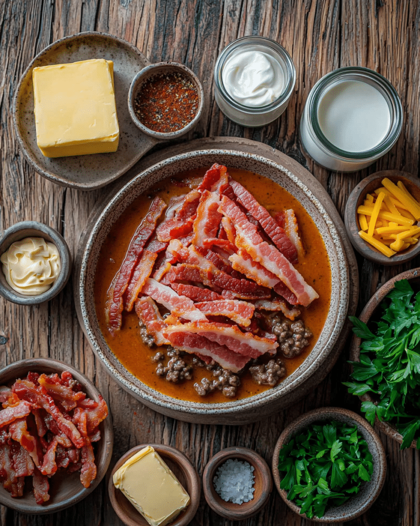 Thick-cut bacon is key for a hearty, smoky base and a crunchy garnish that ties everything together. Butter adds richness and helps brown the beef evenly, bringing out deeper flavors. Lean ground beef keeps the soup hearty but not greasy, the perfect meaty foundation. Cream cheese makes the broth silky and smooth, adding luxurious creaminess without being overpowering. Tomato paste and French mustard add a little tang and depth, mimicking that classic cheeseburger taste. Garlic powder and paprika add warm, savory notes, while salt and black pepper enhance all the flavors. Beef stock and heavy cream create a luscious broth that’s rich without being too thick. Shredded cheddar cheese melts beautifully into the soup, creating cheesy pockets of goodness. Chopped parsley adds a fresh, vibrant finish that balances the richness.