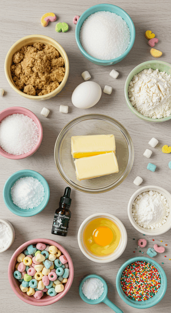 Here’s what you need to make these Lucky Charm Cookies. Each ingredient adds to the buttery, sweet, and colorful magic.