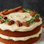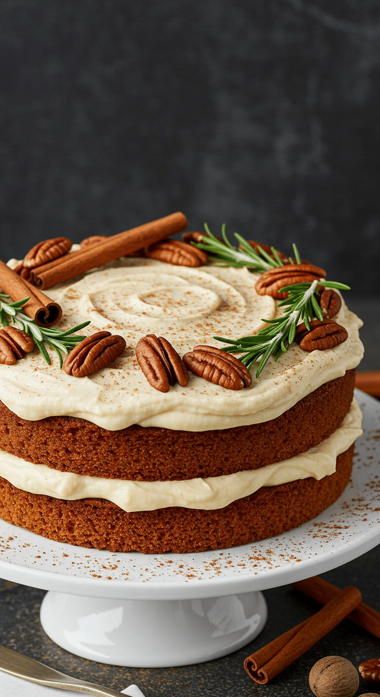 8. Assemble and serve: Place one cake layer on a serving plate; spread with frosting (about 1 cup), leaving sides slightly exposed. Top with second layer and frost top and sides similarly. Garnish with optional pecans, cinnamon sticks, bay leaves, rosemary, or confectioners’ sugar. Slice into 16 pieces. Tip: Chill for 15 minutes before slicing for cleaner cuts.