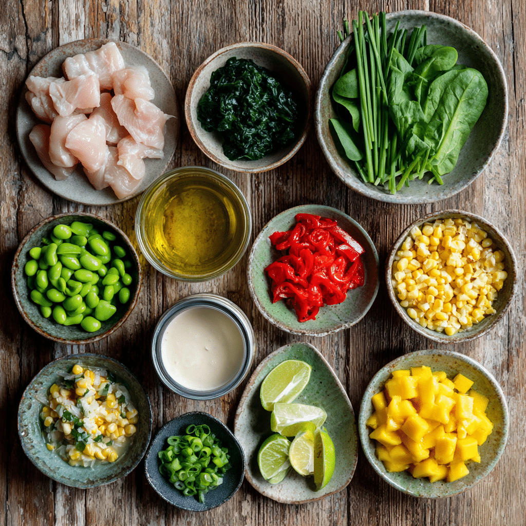 - Layer Veggies: Add drained baby corn, thawed spinach, thawed edamame, and chopped red pepper to the slow cooker, spreading evenly over the chicken.