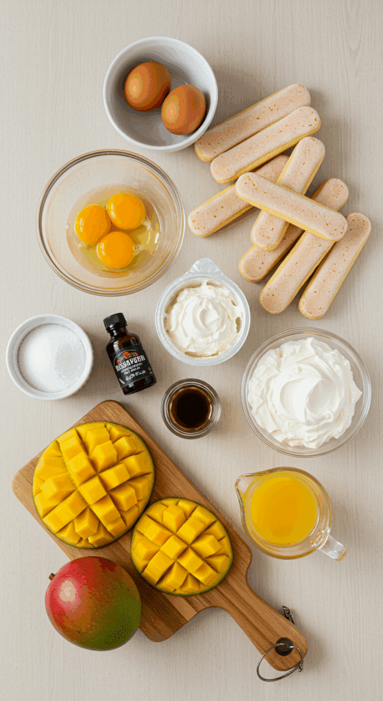 Here’s what you need to make Mango Tiramisu. Each ingredient adds to the creamy, tangy, and tropical magic.