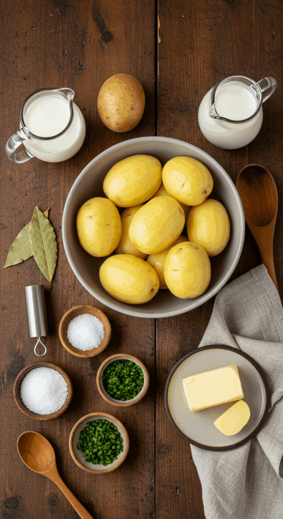 - Gather all ingredients: 4 pounds golden creamer potatoes, 1 bay leaf, 2 tablespoons kosher salt, 2 cups heavy cream, 3 tablespoons unsalted butter, 2 tablespoons chopped chives, salt, and pepper.