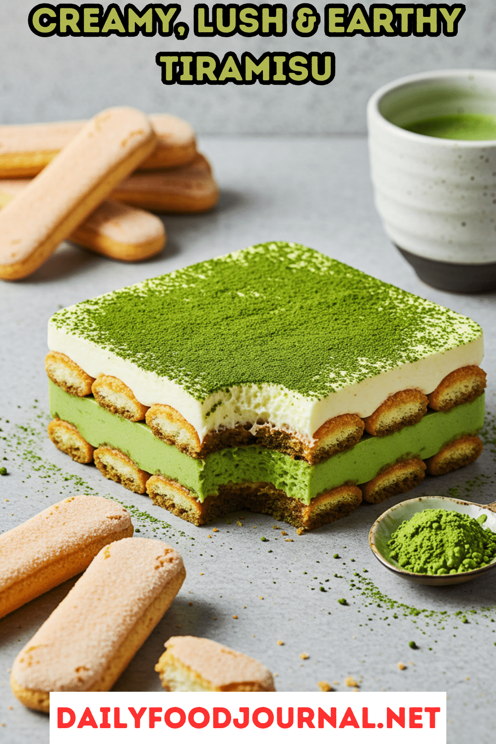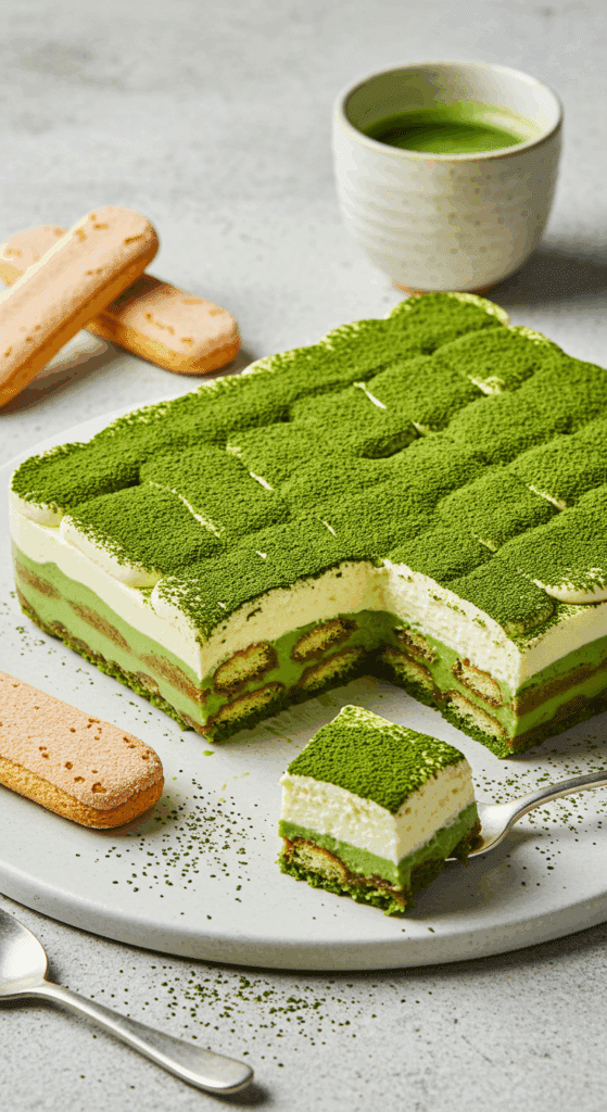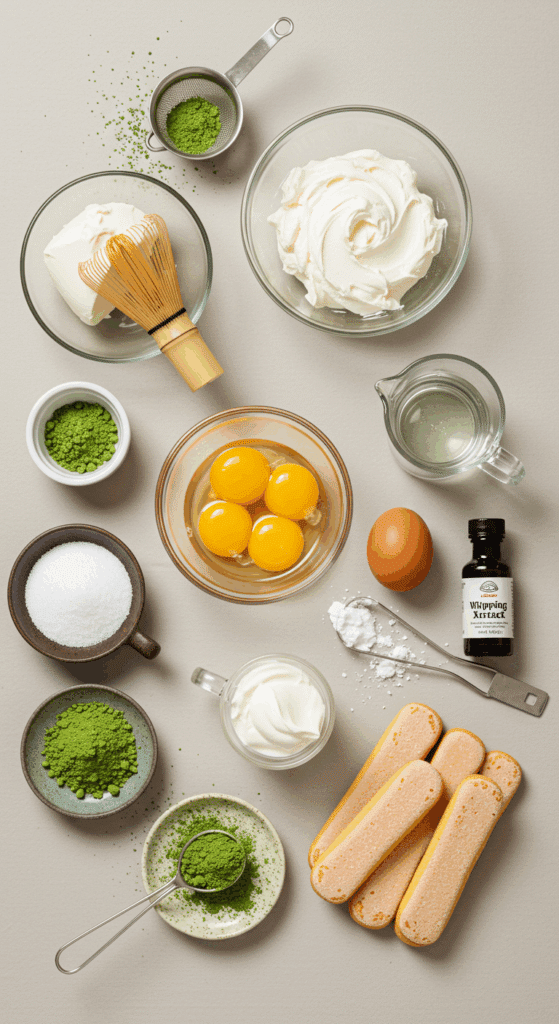 Why These Ingredients Matter: The matcha provides a unique earthy flavor and vibrant color, the mascarpone cream adds rich creaminess, and the ladyfingers create a soft, layered texture that defines tiramisu.